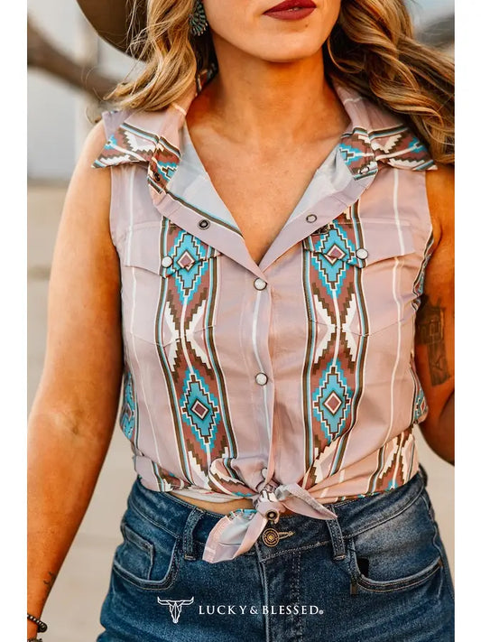 Neutral Aztec 90s Pearl Snap Sleeveless Button Down