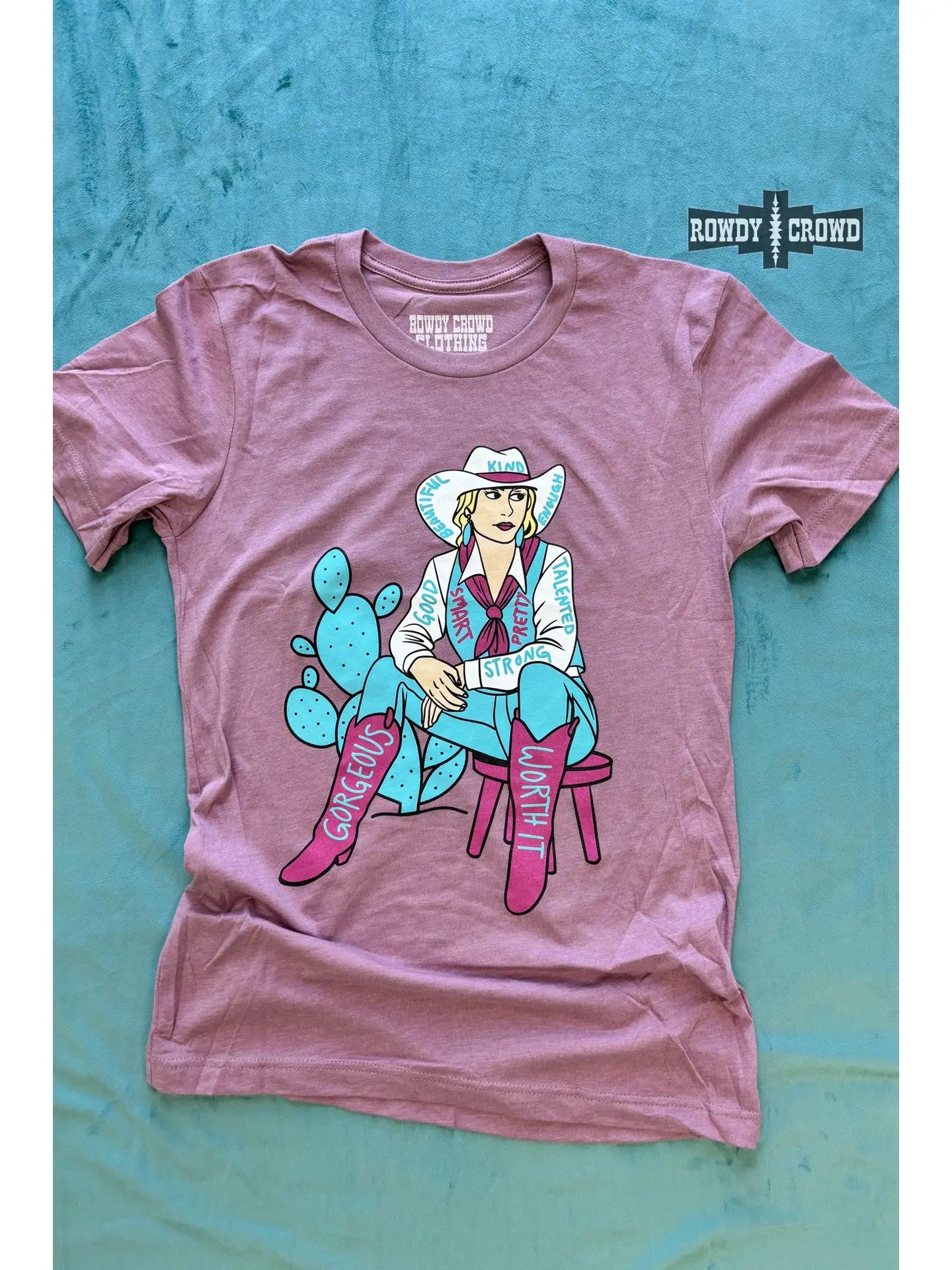The Cowgirl Affirmations Tee is a pink, screen-printed t-shirt with a geometric pattern.