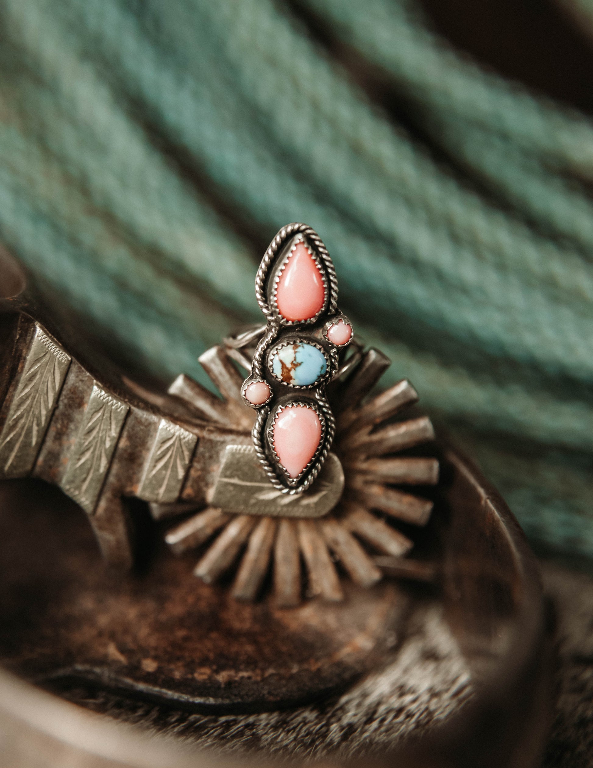 This ring is STUNNING. .925 Sterling Silver and Golden Hills paired with Pink Conch and dainty details to make a gorgeous piece. Double wire band that adds to the beauty.
