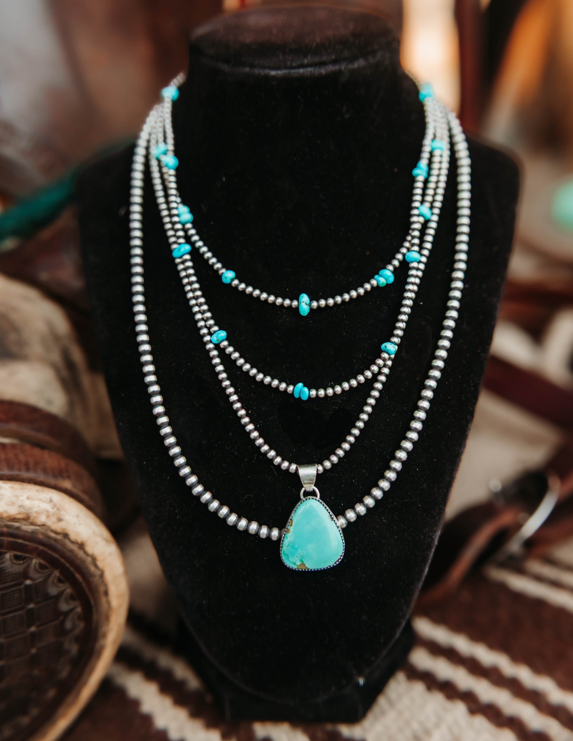 .925 Sterling Silver with Turquoise. A piece perfect for anything. Can be a perfect wedding accessory or even with a t-shirt to work. Very simple, but you know she is there.