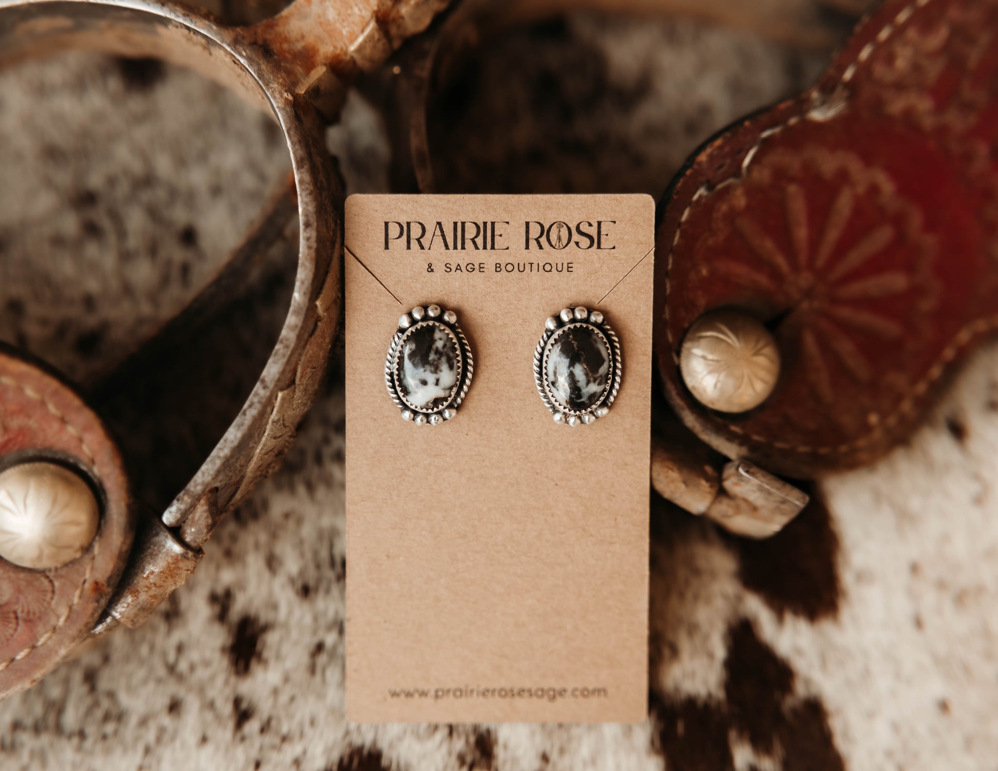 .925 Sterling Silver studs with White Buffalo center stones. These have dainty details all the way around and are perfect for dressing up and down! Stunning set.