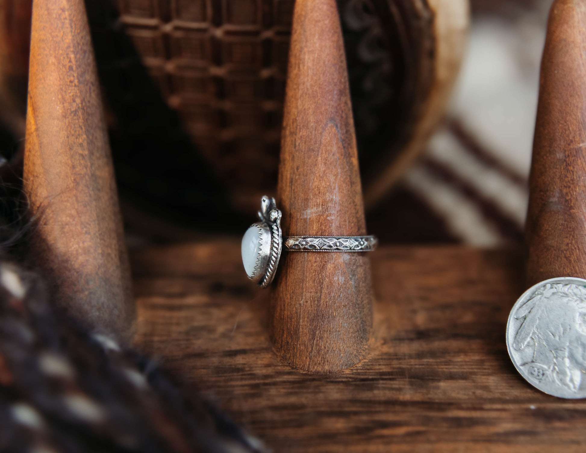 Cute .925 Sterling Silver and Moonstone ring. So cute and dainty. With a patterned wire band and cute handmade silver embellishments, she is so unique and perfect. Accented with a small rope wire. She can be a perfect stacker or individual piece!