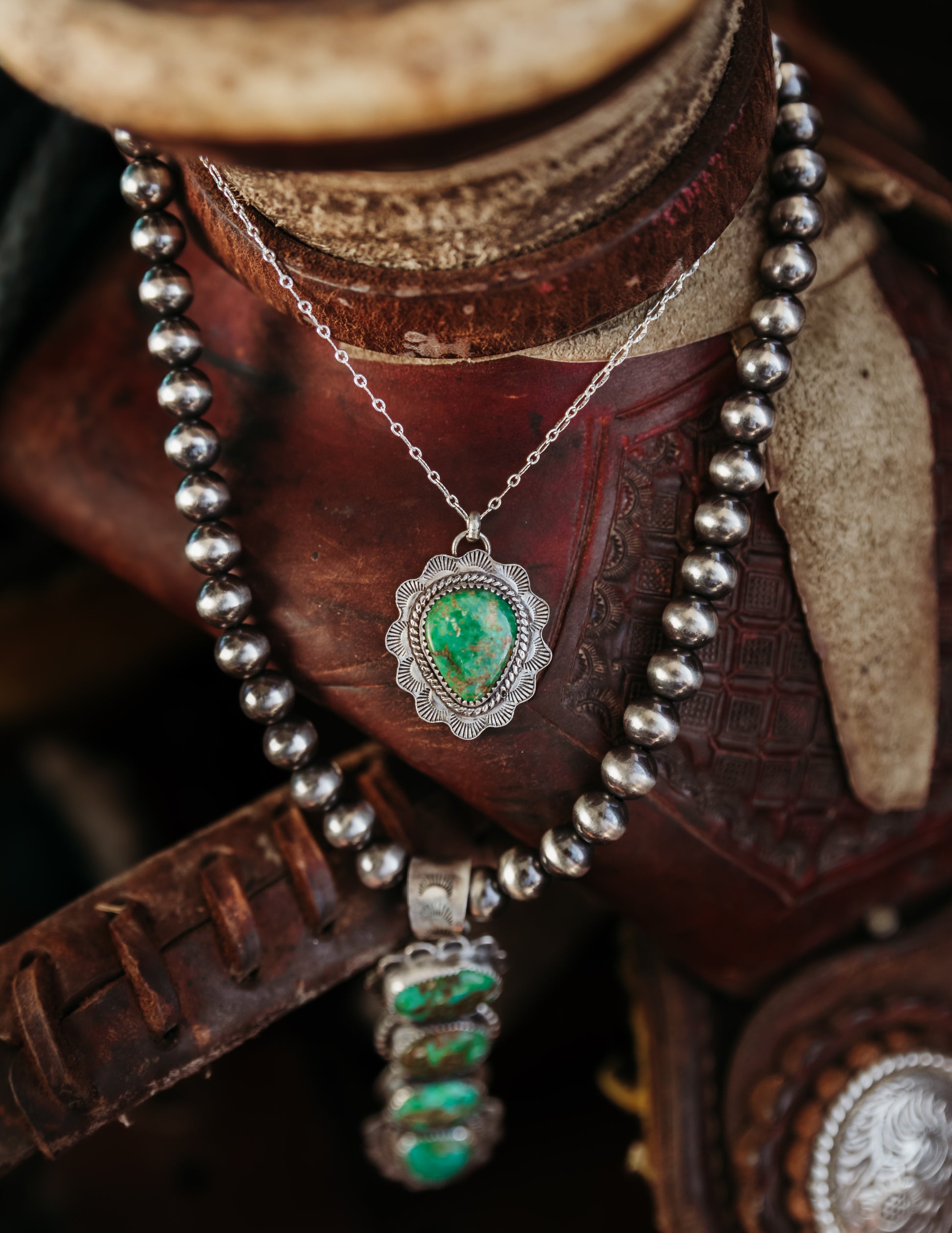 .925 Sterling Silver with Cielo Turquoise. Perfect everyday or stacking necklace. The handmade stamp work pairs her perfectly with any of our other Cielo or Palomino pieces(Stamped or not!).