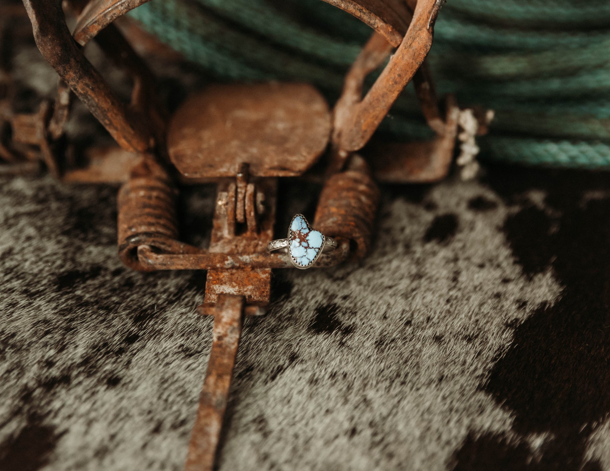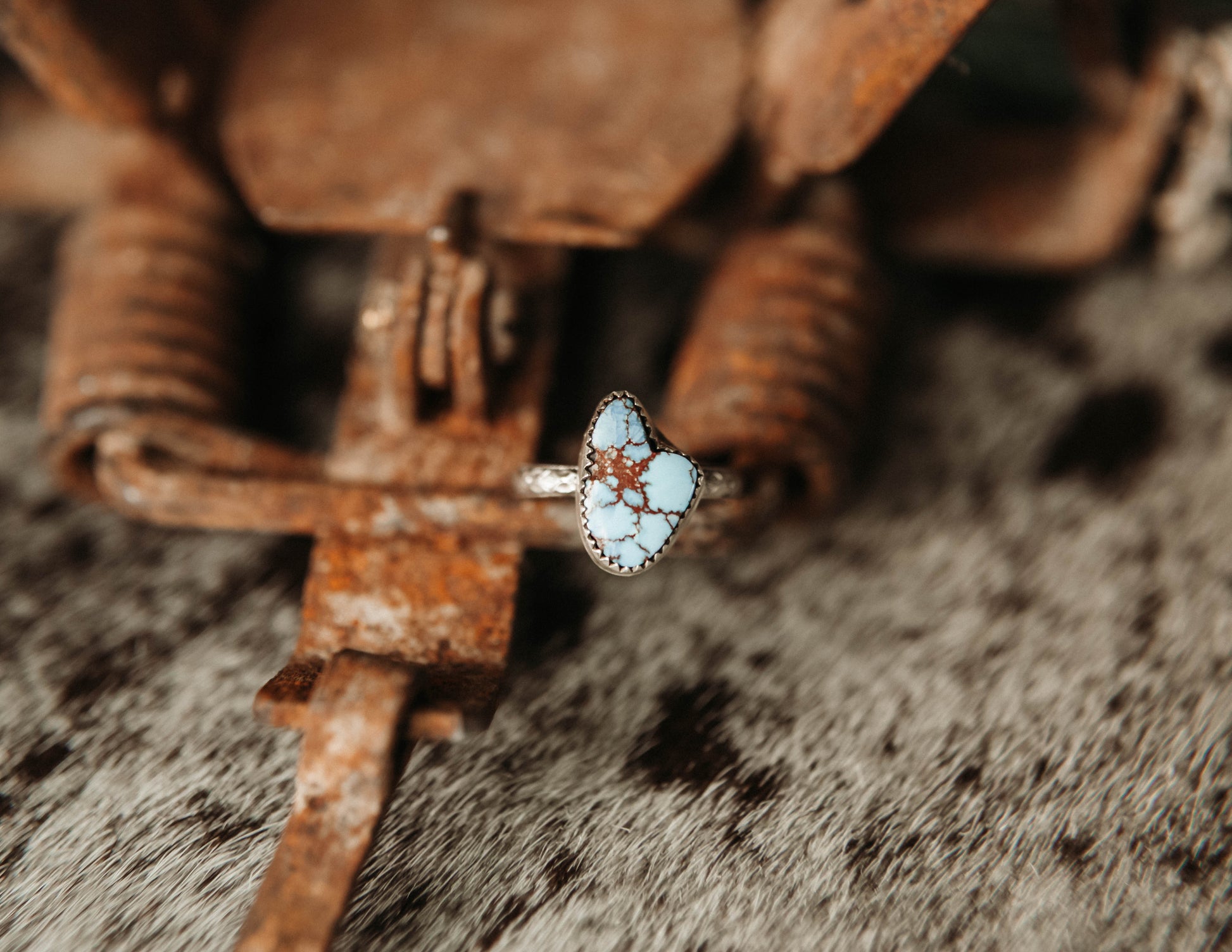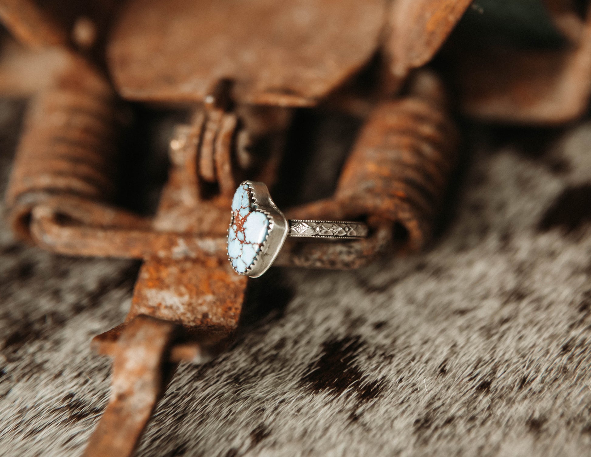 Unique .925 Sterling Silver and Golden Hills stone with a stunning and detailed band. Cute as a stacker or standing alone.